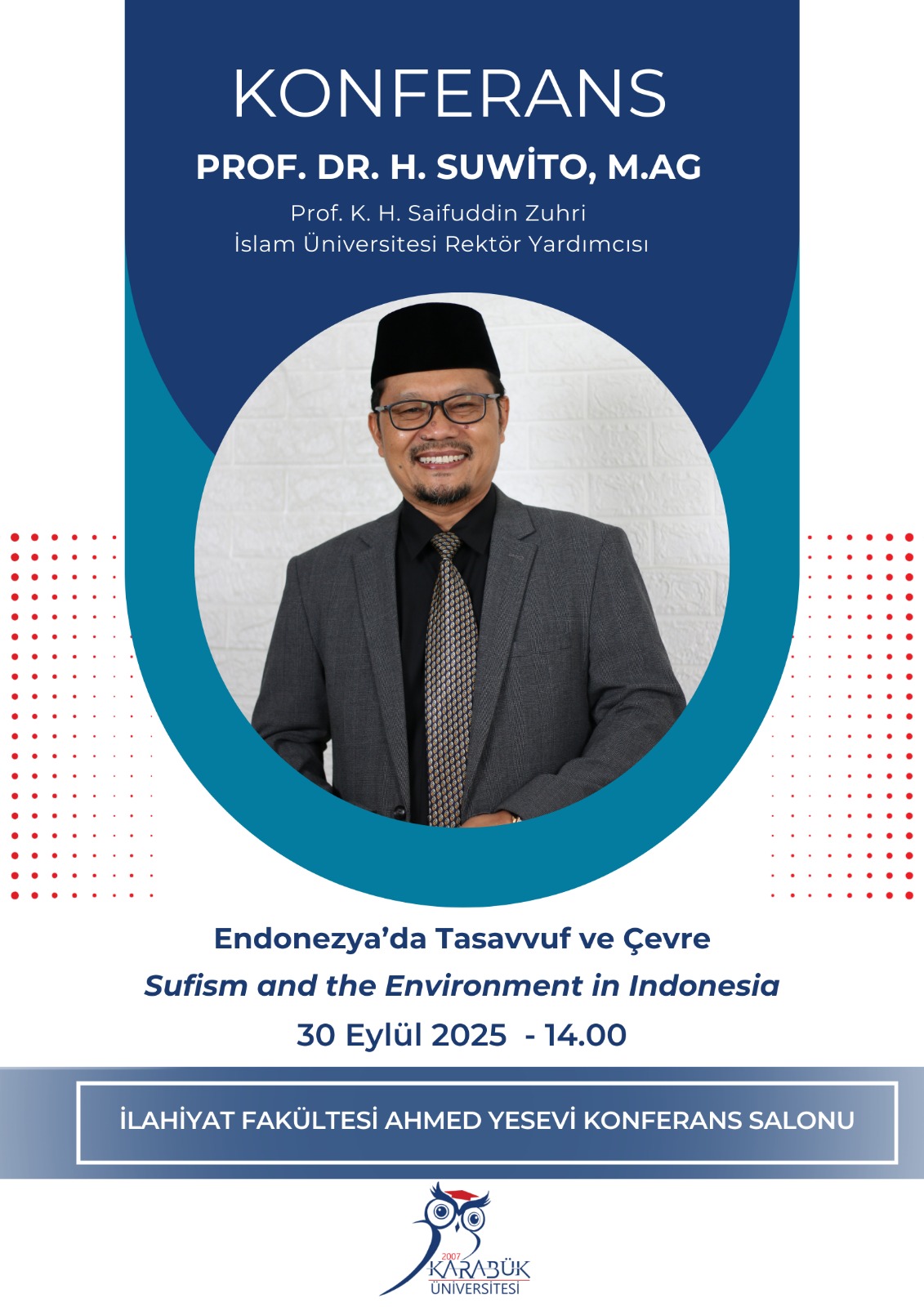 Prof. K. H. Saifuddin Zuhri İslam Üniversitesi rektör yardımcısı Prof. Dr. H. Suwito'nun sunumu ile "Endonezya'da Tasavvuf ve Çevre" başlıklı konferansımız, 30.09.2025 Salı günü fakültemiz Ahmed Yesevi Konferans salonunda saat 14:00'de gerçekleştirilecektir.